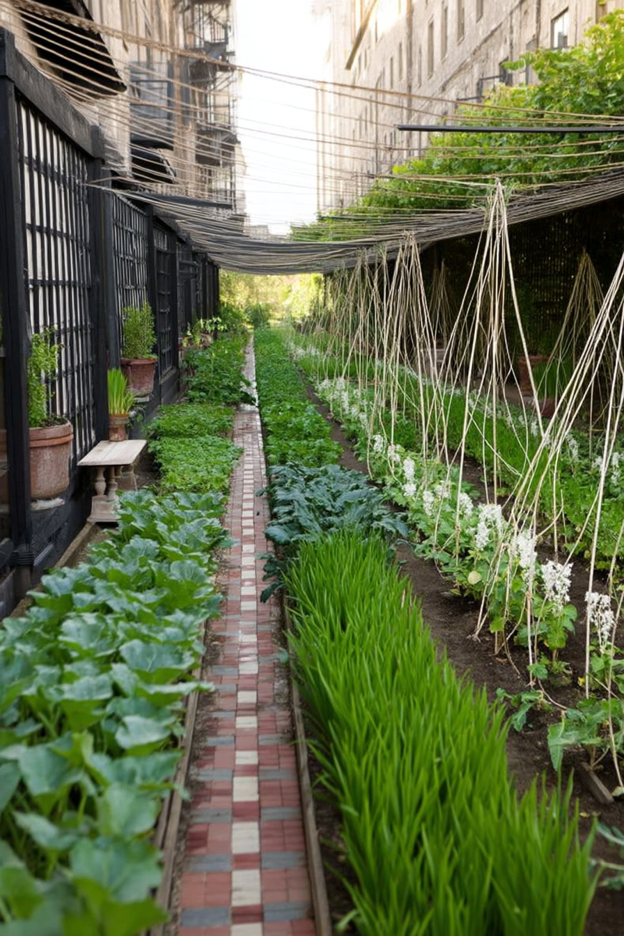 Adding trellis supports for climbing vegetables and saves space. The gravel paths also improve drainage and prevent muddy walkways. Movement between beds becomes easier and cleaner.