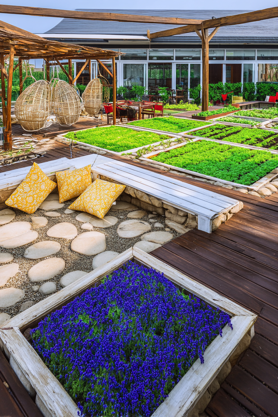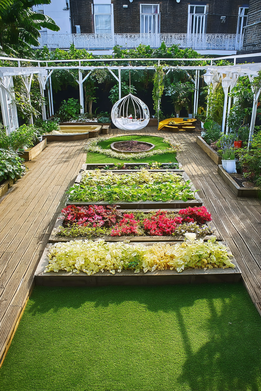 Combine planters with raised beds to use every inch of space. This setup looks clean, saves space, and boosts your harvest.