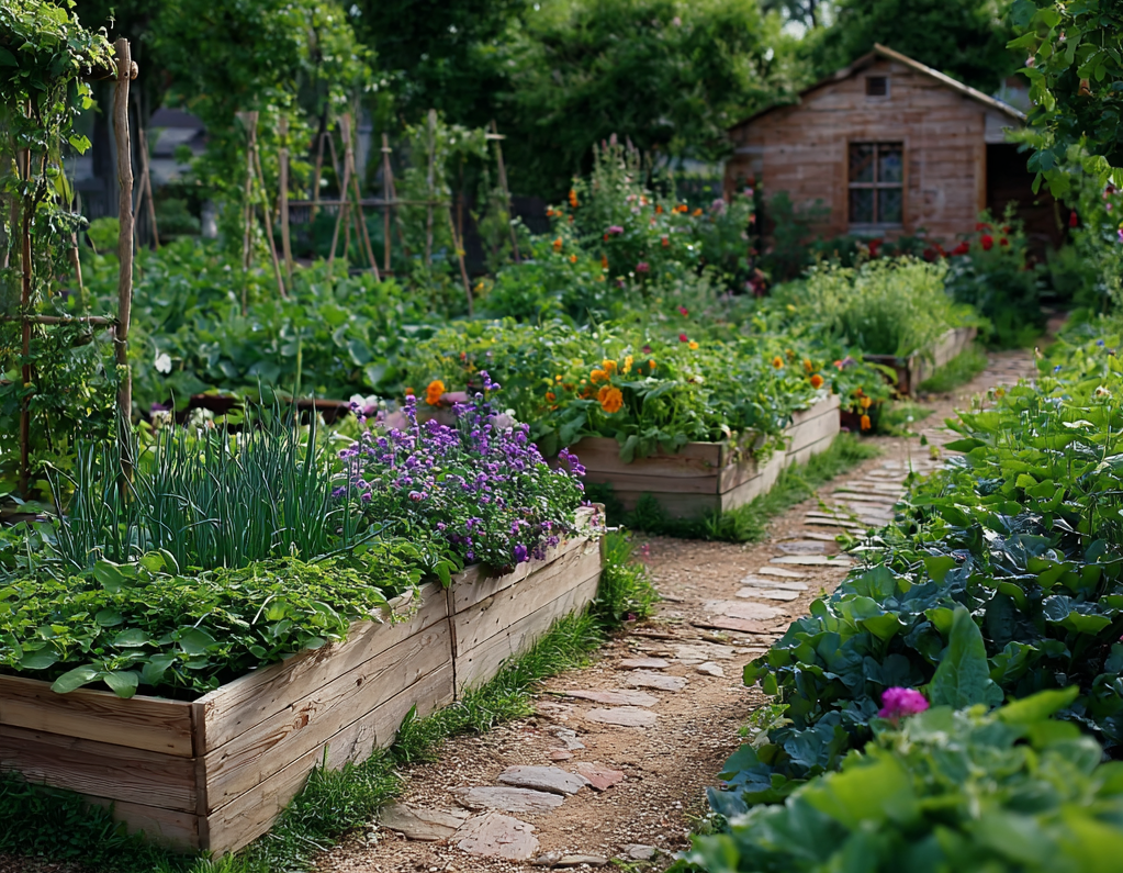 A potager vegetable garden blends beauty and purpose. This French-inspired design uses raised beds arranged in neat patterns. Gravel paths between beds keep the layout tidy and reduce weed growth.