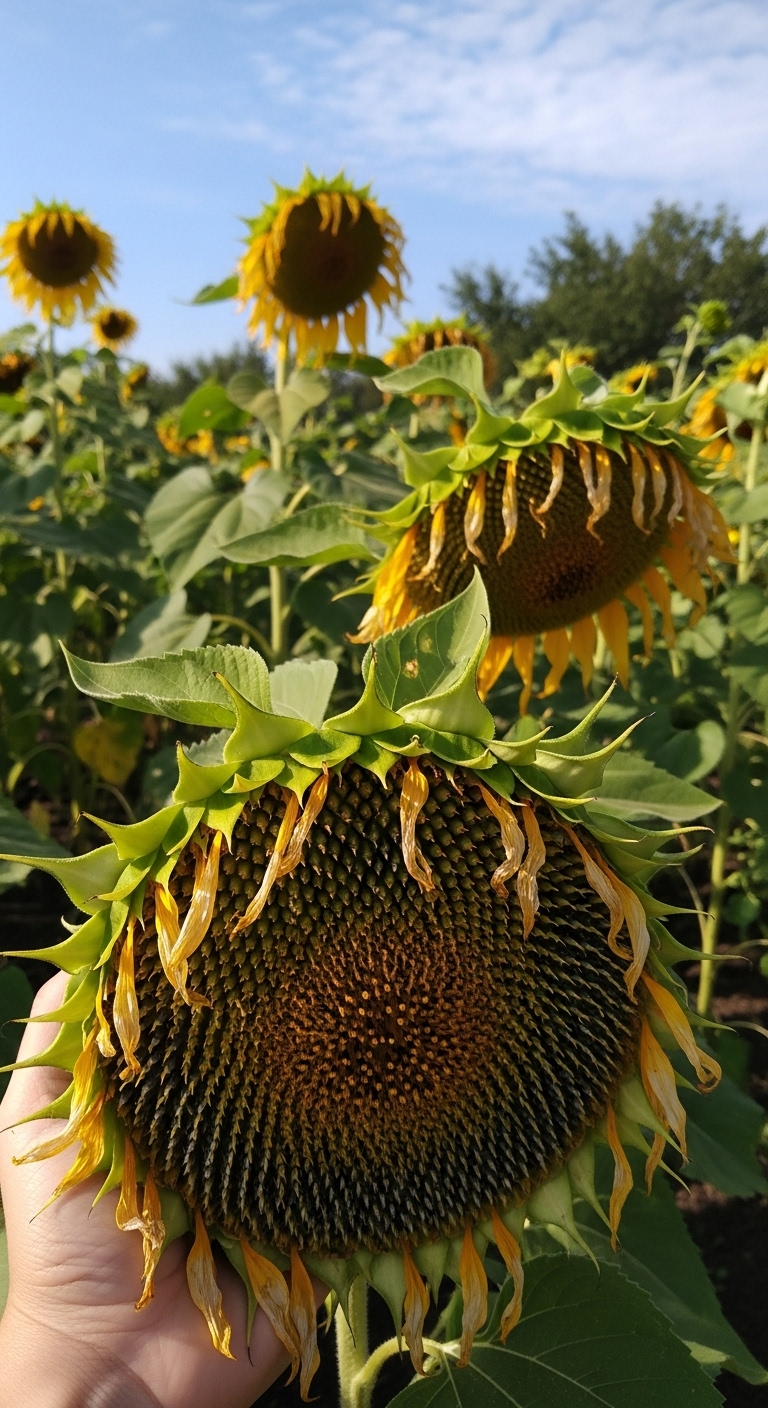 Sunflowers are one of the simplest to harvest. When the petals have fallen and the back of the flower head turns yellow or brown, snip it off. Even if not fully dry, you can hang it upside down. Once dry, rub out the seeds and store them until spring. Easy and reliable!