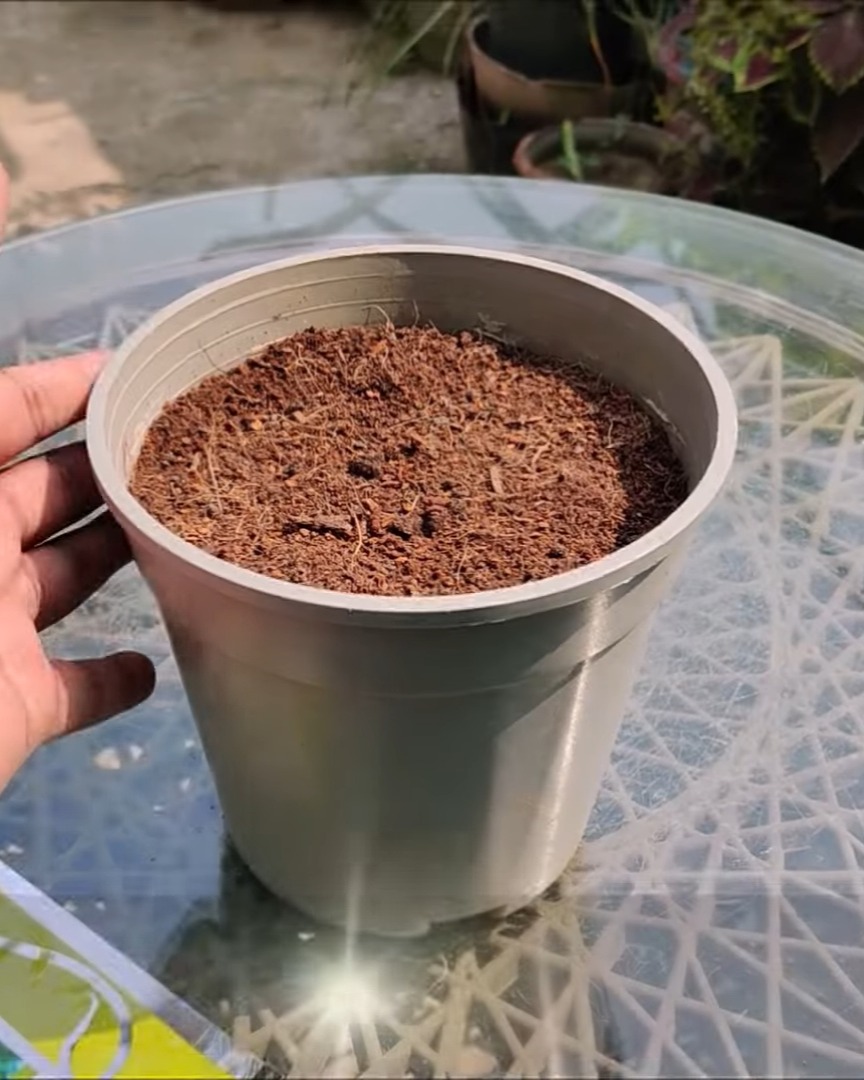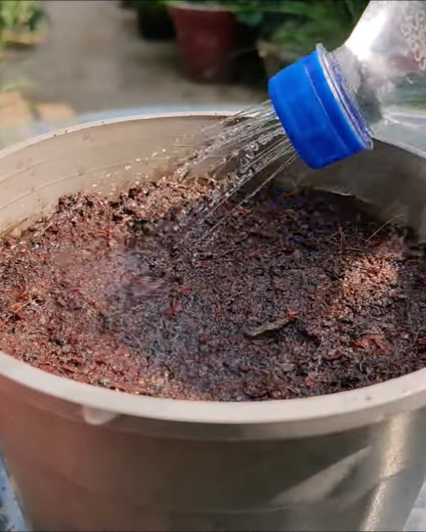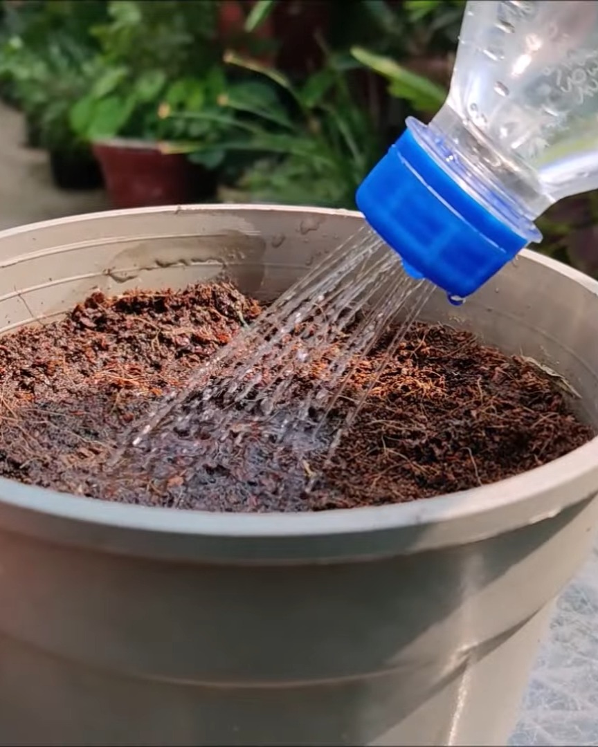 I sprinkle water lightly — just enough to keep the soil damp. Then, I move the pot to a sunny spot.