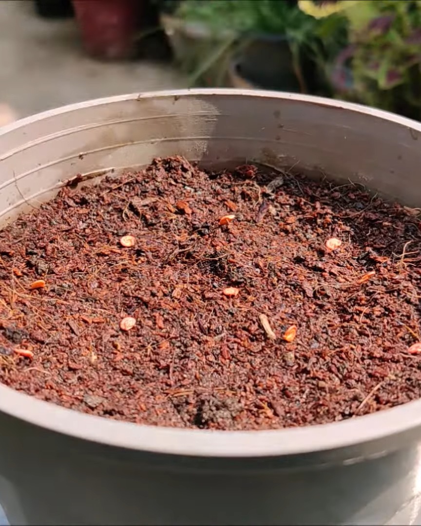 Before I sow the seeds, I water the mix thoroughly. It’s not too soggy — just damp enough to help the seeds settle in nicely.