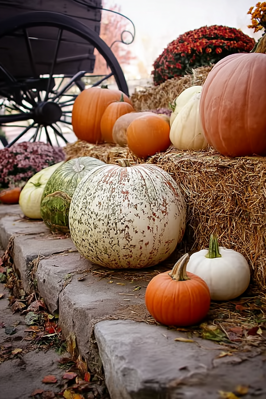 Use a mix of sizes to keep the display playful and balanced. Nestle a few near blooming mums or line a path with small clusters.
