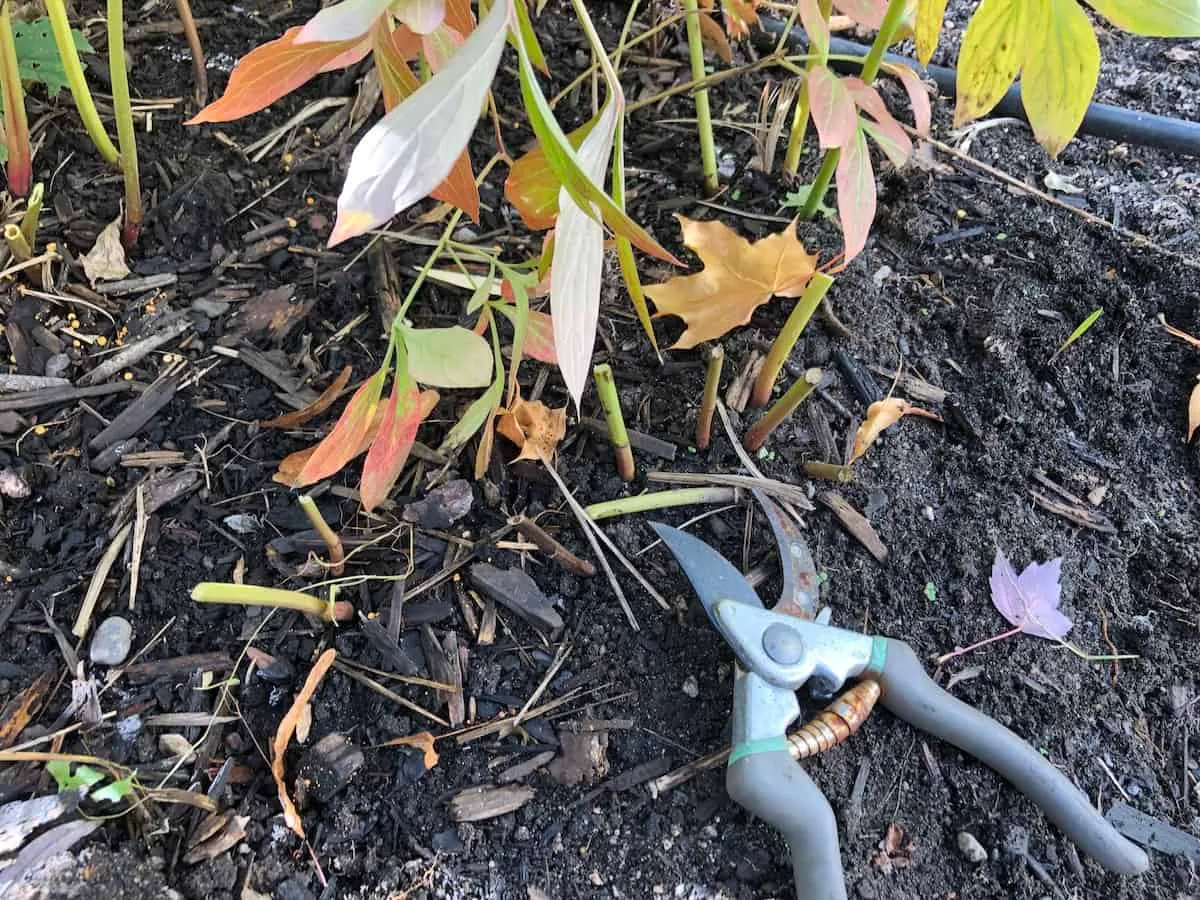 In the fall, cut your peony stems back to about 3 inches above the ground and remove any diseased foliage (don’t compost it). Though generally pest-free, peonies can suffer from powdery mildew or botrytis blight in cool, wet conditions. Water early in the day and make sure there’s good airflow around the plants.