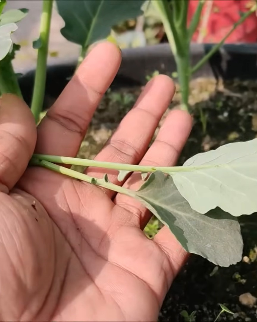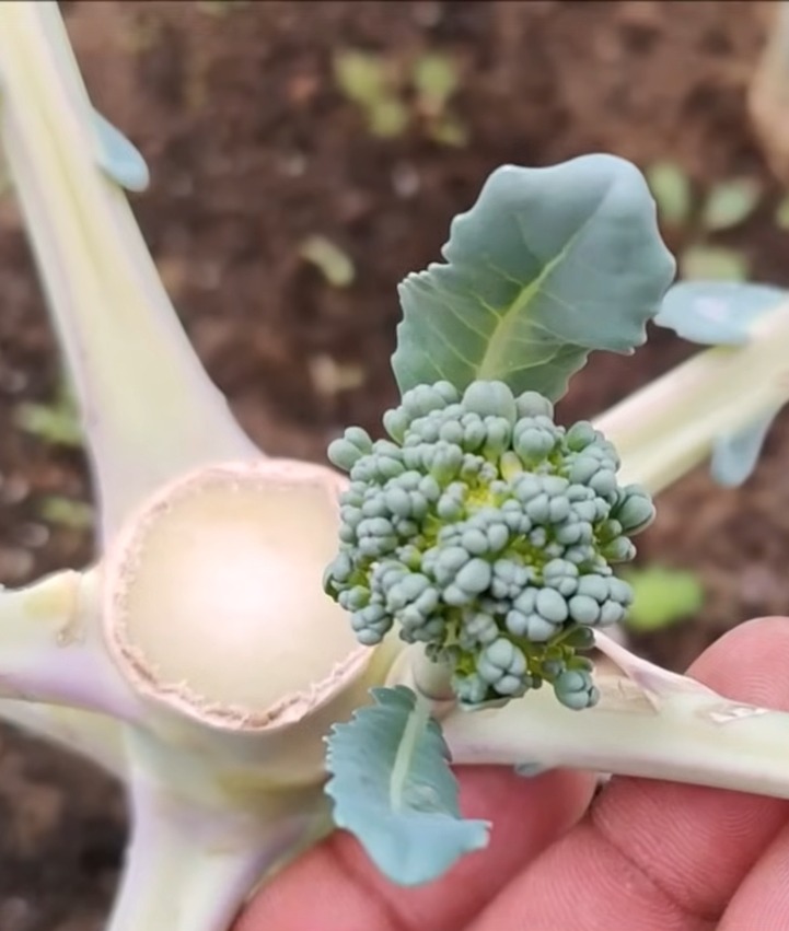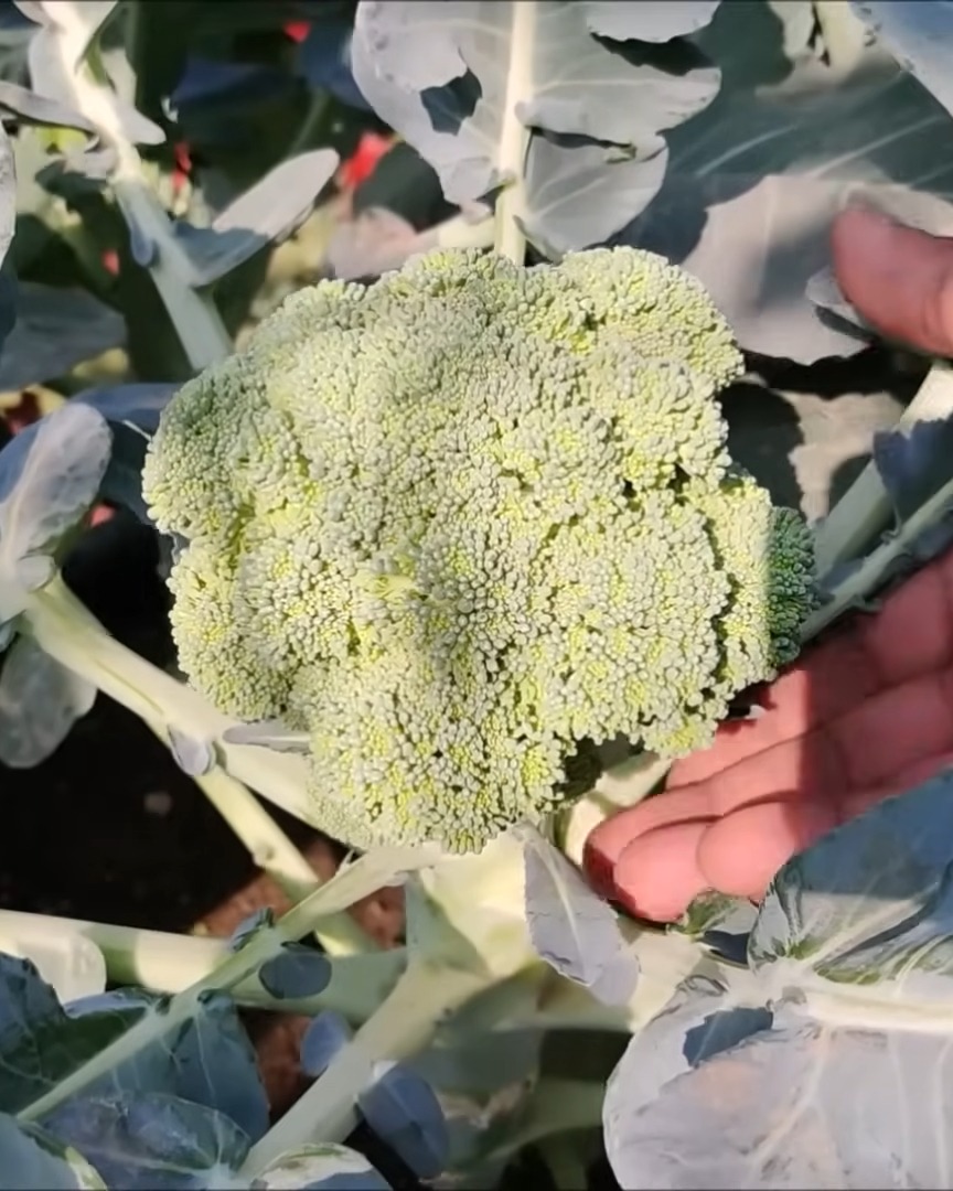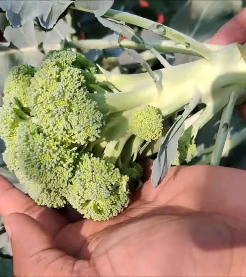 Cover the broccoli head with large leaves. I do this to keep it dry and safe from pests. Wet heads can rot easily, and leaves give them natural protection.