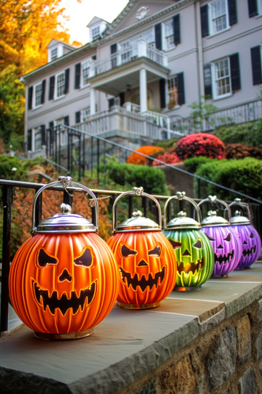 The suggestion here is to use lanterns shaped like skulls, pumpkins, or haunted houses. They add a fun, creepy touch to pathways and patios.