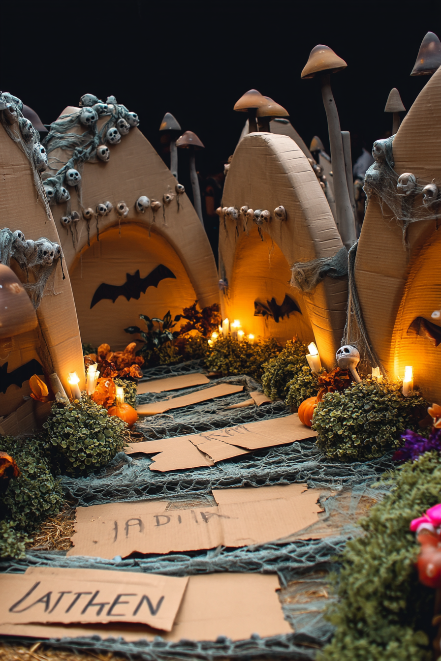Curve the walkway or block parts with props to build mystery. This setup makes trick-or-treaters thrilled.