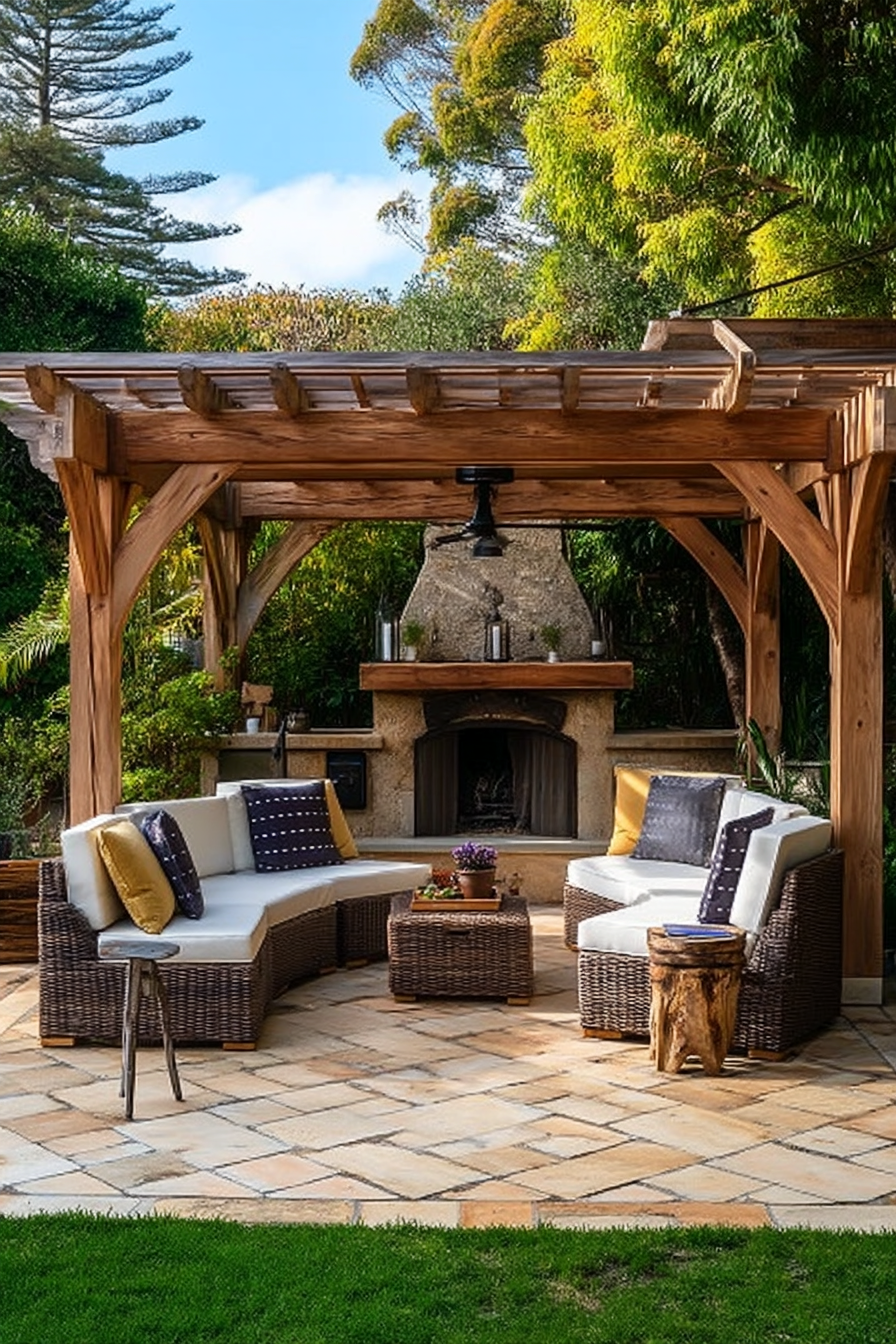Perfect for lovers of nature and earthy tones. Use reclaimed beams for the pergola, let wisteria or grapevines crawl over the top, and add flagstone flooring.