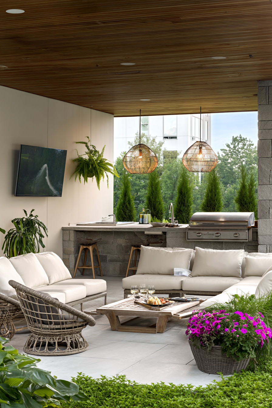 Install a grill, fridge, and prep counter. Pair with a long table, overhead pergola, and plenty of lighting. Think BBQs, birthdays, and long summer nights.