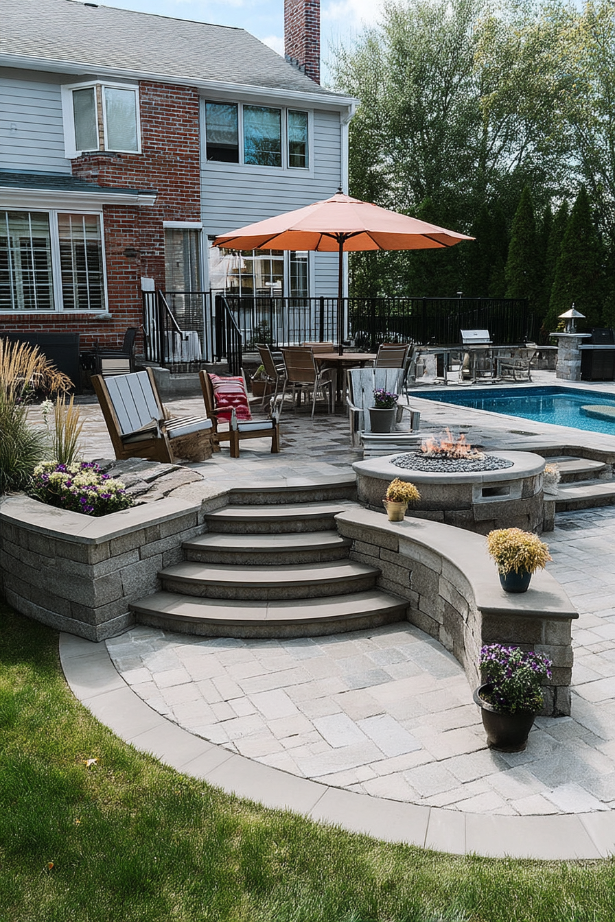 One level for dining, another for lounging, maybe even a sunken fire pit. Use cohesive materials to unify the look — like matching wood, stone, or composite.