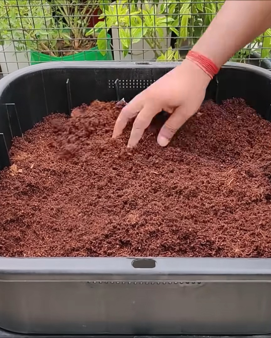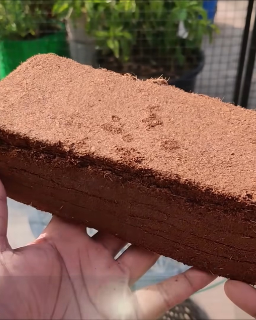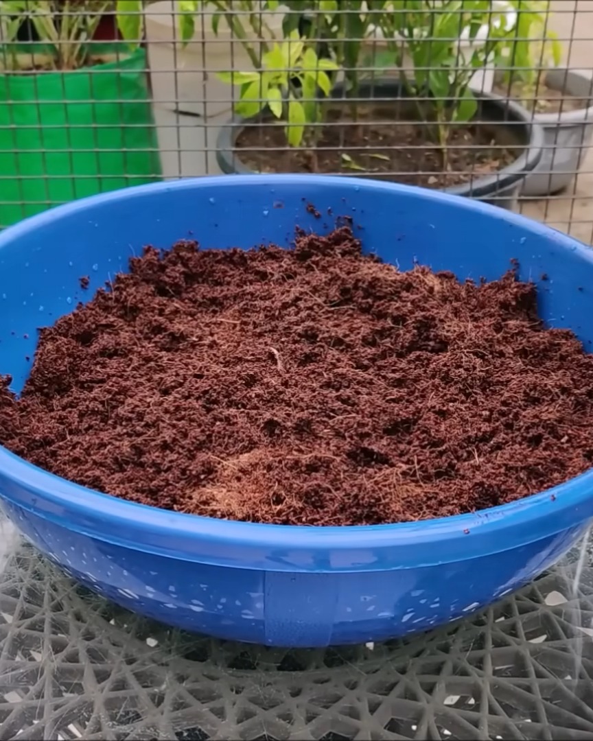 I soak the coco peat brick in 7 to 8 liters of water. After about 5 to 10 minutes, it expands and becomes soft and fluffy. That’s the base.