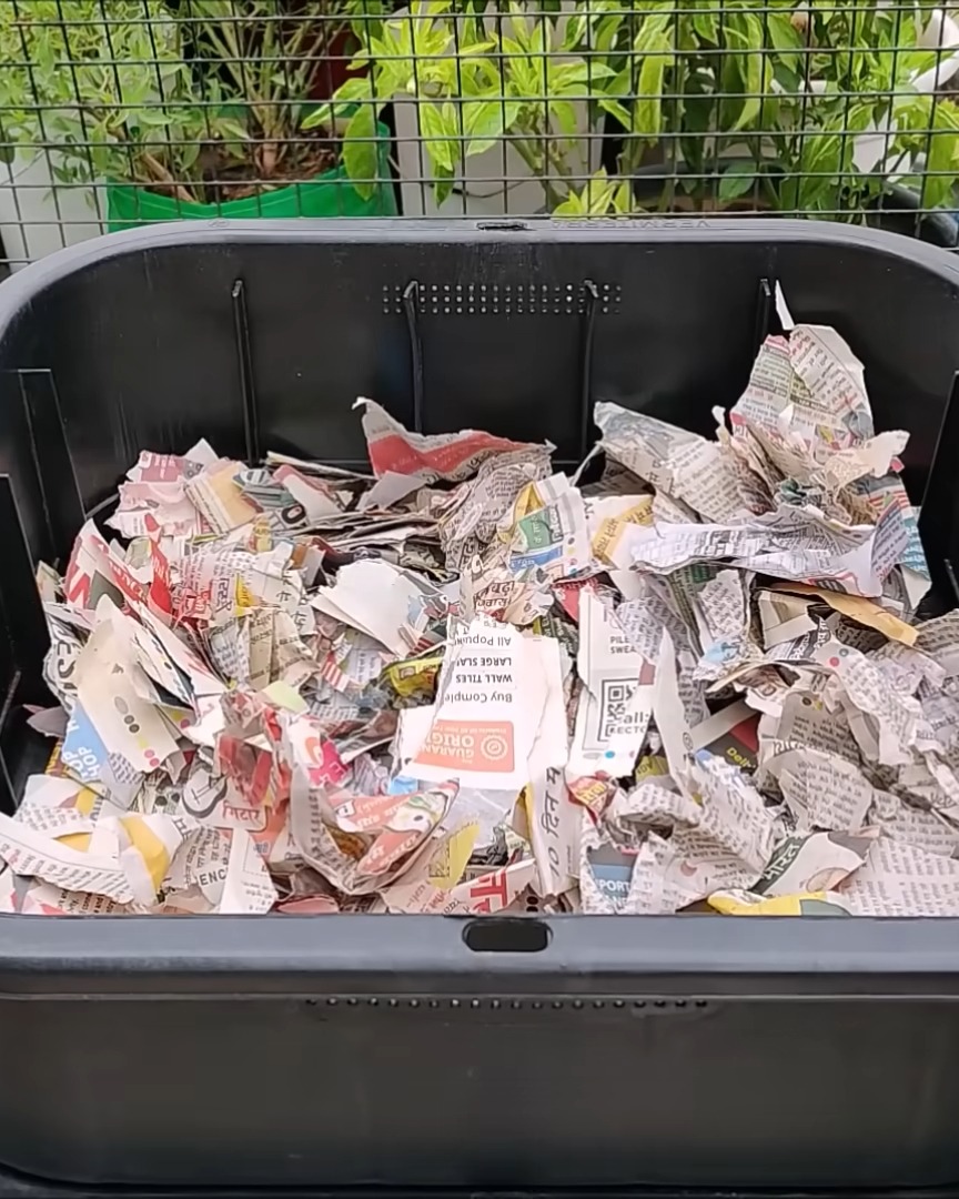 Then, I add shredded newspaper and cardboard pieces. I fill the bin about 3 to 5 inches high with this mix. Worms love bedding that holds moisture well, so paper and cardboard are perfect!