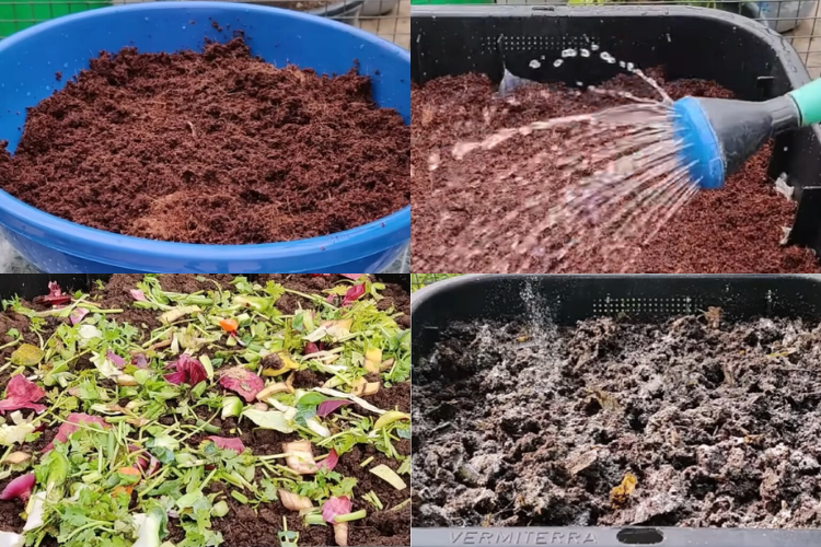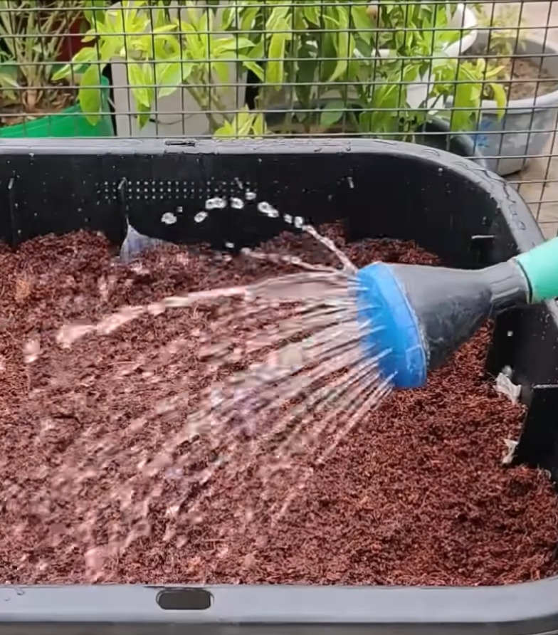 Next, I add the expanded coco peat and sprinkle water to maintain 50–60% moisture. If it gets too wet, I toss some dry shredded paper or dry leaves.