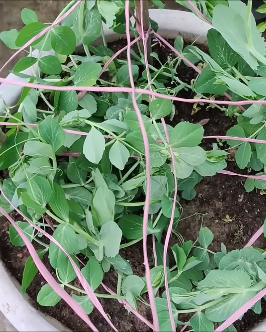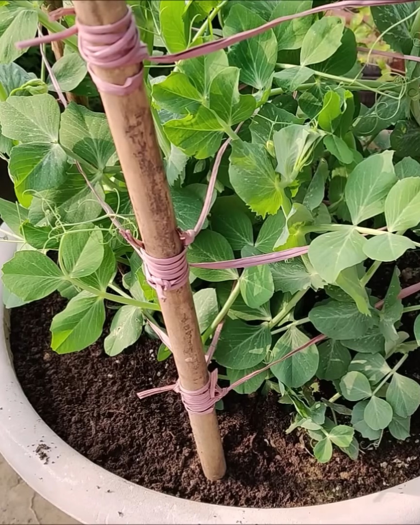 As they grow, I gently guide the vines toward the support. Peas have shallow stems and can break if pulled too hard, so I’m always extra careful.