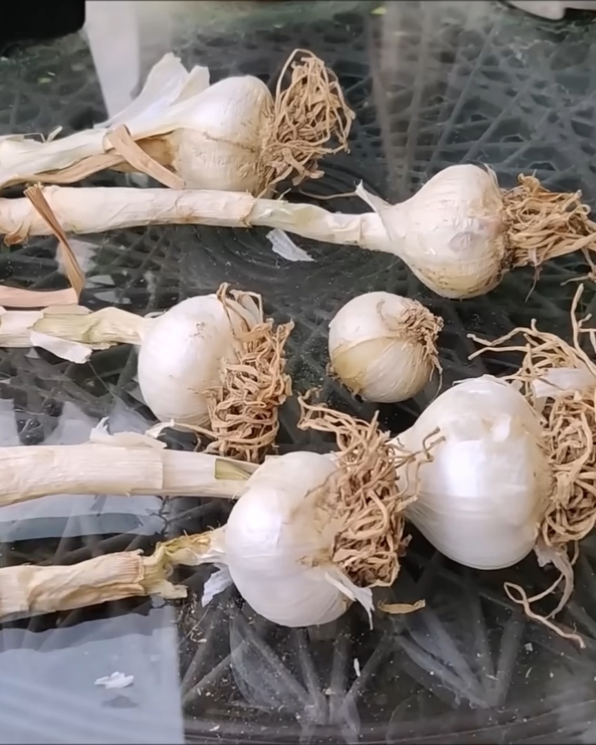 I let the garlic bulbs dry for 8 to 15 days. I keep them in a dry, shady area with good airflow. Once they feel flaky, they’re ready.