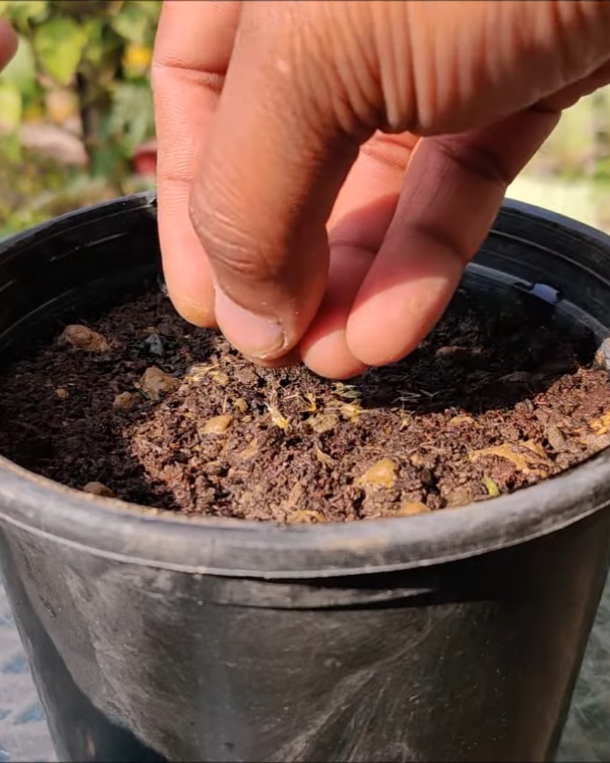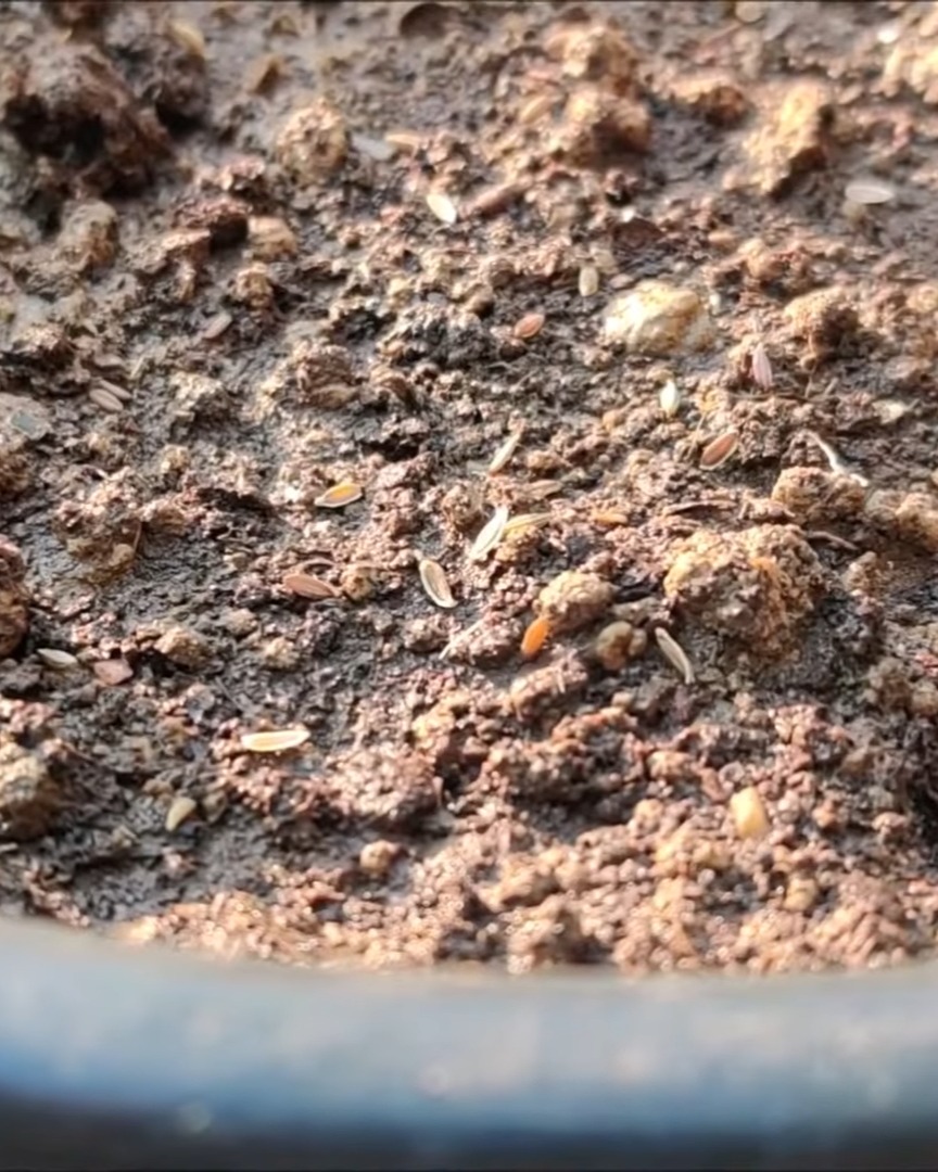 I moisten the soil and scatter the seeds evenly. Then, I lightly cover them and press the surface gently.
