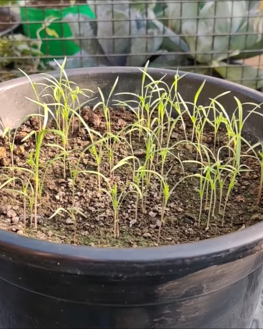 Day 28: When the seedlings grow to 4–5 inches, I thin them out, leaving about 5–6 inches between the strongest ones. I use the thinnings as microgreens!