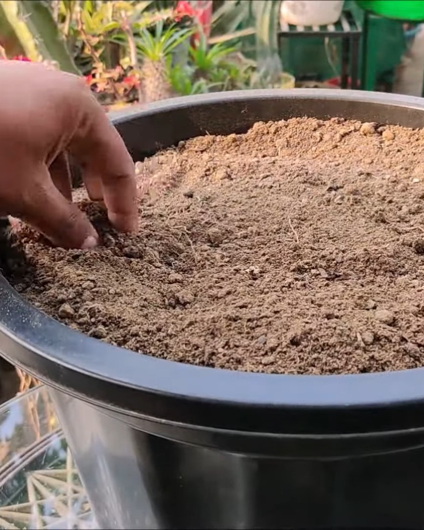 Then, I fill in the gaps, press the soil gently, and water thoroughly.
